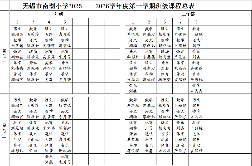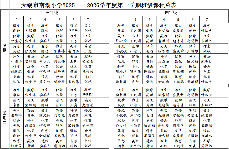 > 无锡市南湖小学2025——2026学年度第一学期班级课程总表
